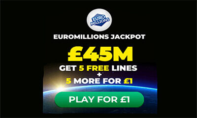| Get 5 free EuroMillions tickets for tomorrow's draw when you buy 5 for just £1. The jackpot is a huge £45 million so you won’t want to miss out! All you have to do is pick your numbers and enter your details. Then buy 5 lines for just £1 and get 5 extra lines for free! Just make sure to get your tickets today. 18+ only. |