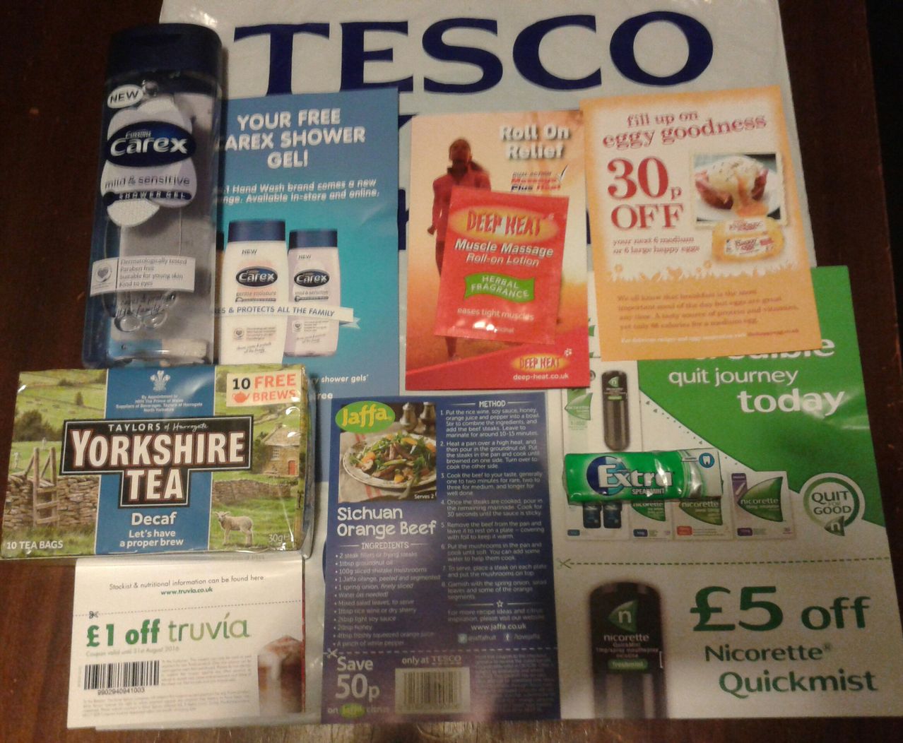 about it.Sometimes they make them up and keep them in a box in back.The goodie bag contains: full size Carex shower gel, free samples of Deep Heat muscle massage gel, Truvia sweetener, Wrigleys Extra, Yorkshire Tea 10 pack and money off coupons (PROOF).