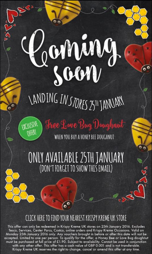 Print off the linked image and take it to your local Krispy Kreme store after the 25th January and before 14th February and you can get a free Love bug Doughnut when you buy a Honey Bee Doughnut.