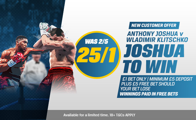 Open a new Coral online or mobile account and bet on Joshua to Win – Anthony Joshua v Wladimir Klitschko – 25/1. Offer available to UK & Republic of Ireland residents aged 18 years or over opening a new Online, Mobile or Coral Connect account in either £/€ currency through http://promotions.coral.co.uk/landing-pages/crazy-prices2,