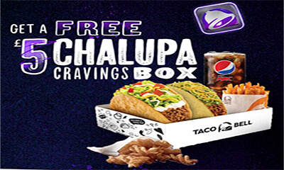 | Taco Bell is giving away free £5 Chalupa meal boxes! To claim, you will need to download the Taco Bell loyalty app. Enter the code 7ayWi5b1724 when it prompts you at sign up. Go to 'Rewards' and you will see an offer for a £5 Chalupa Box. Go to a participating store to order your meal, get the staff to scan this and you'll get it for